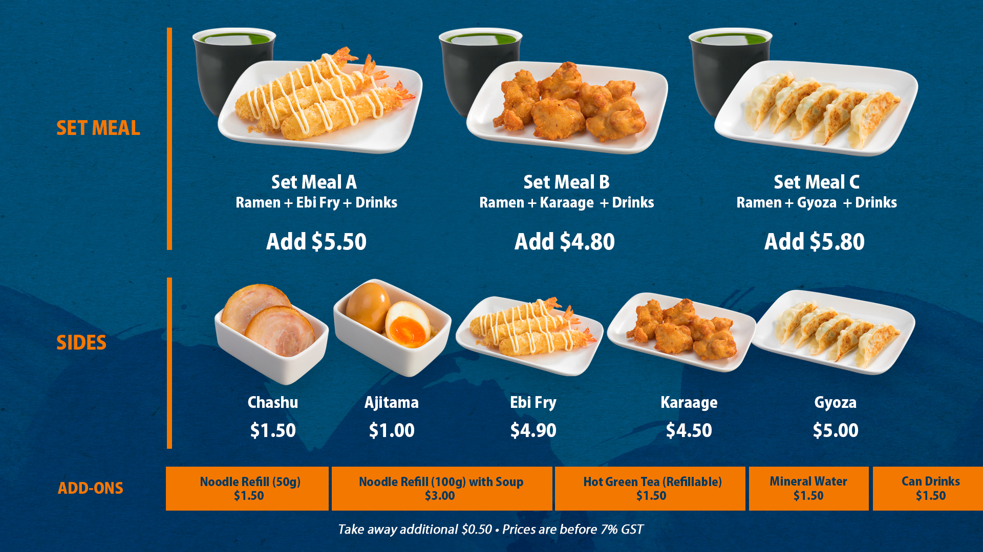 We only use freshly made Hakata style Ramen, with 6 hours of hard boiling to achieve a full collagen richness in our broth without adding MSG.